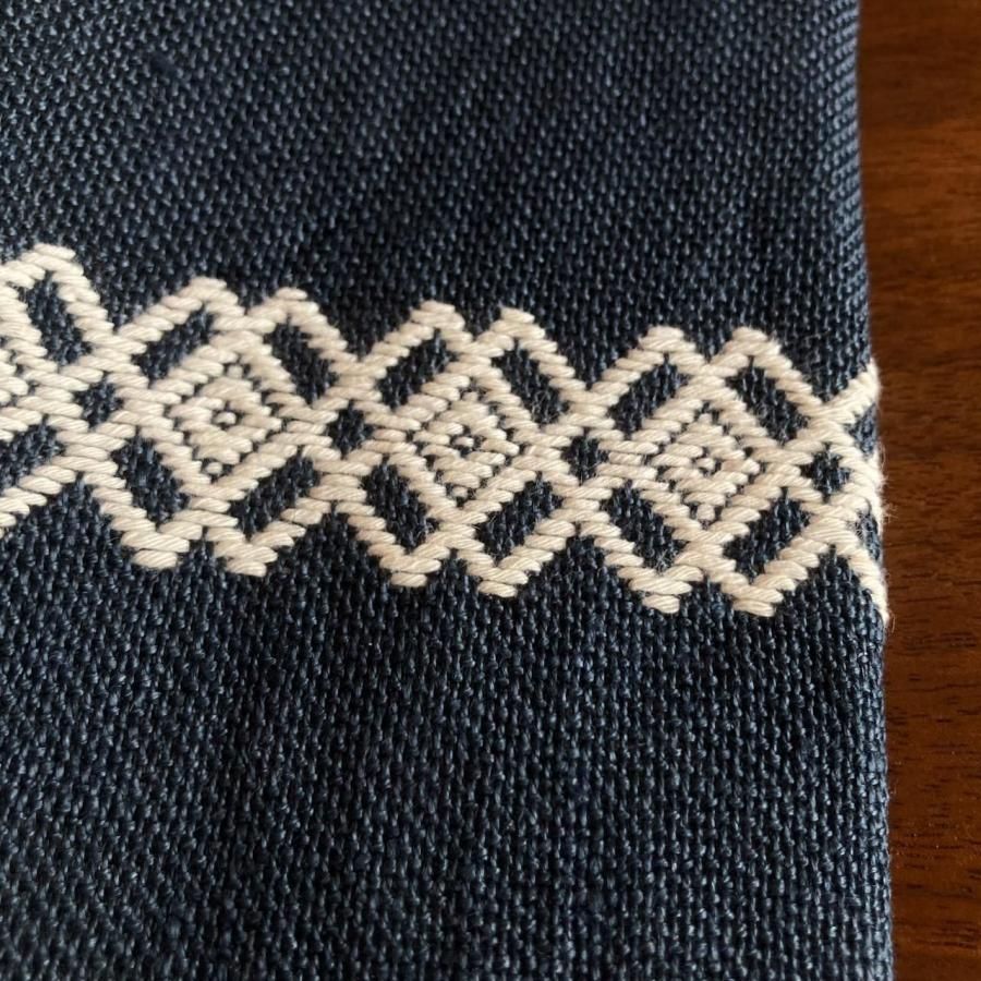目の粗い麻生地にふくよかな綿糸のこぎん刺し。模様が立体感を与え、手仕事のぬくもりを伝えてくれます。