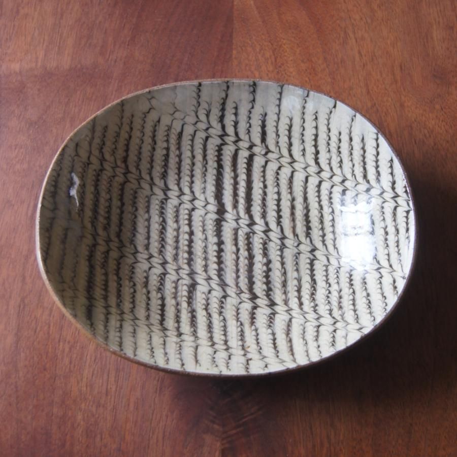 これは、スリップを櫛の歯のようなもので掻いて、模様に変化をつけています。