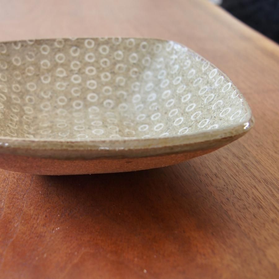 齊藤十郎さんの象嵌は、土にスタンプのようなもので文様を押し、凹んだところを白土で埋める、という技法で作られています。