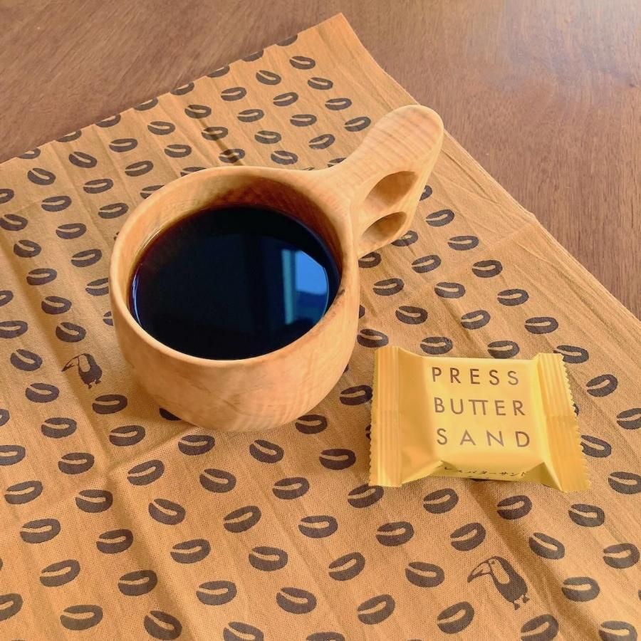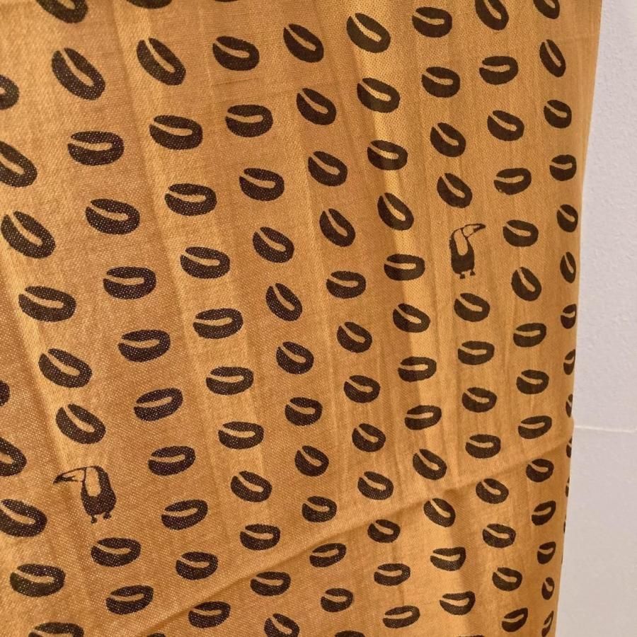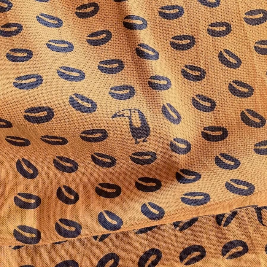 コーヒー豆の入っている「麻袋」をイメージした地色に、珈琲豆とオニオオハシが並んだ愉快なデザインです。