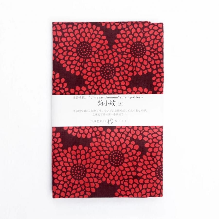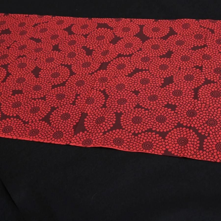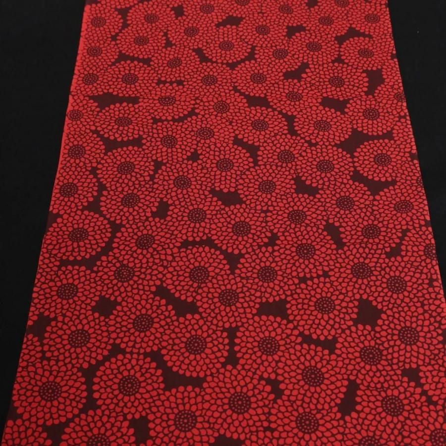 少し鈍い赤で染められた生地の上に注染で濃い茶色の柄が染められています。